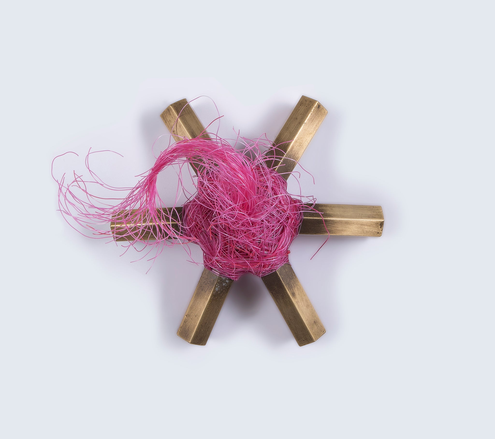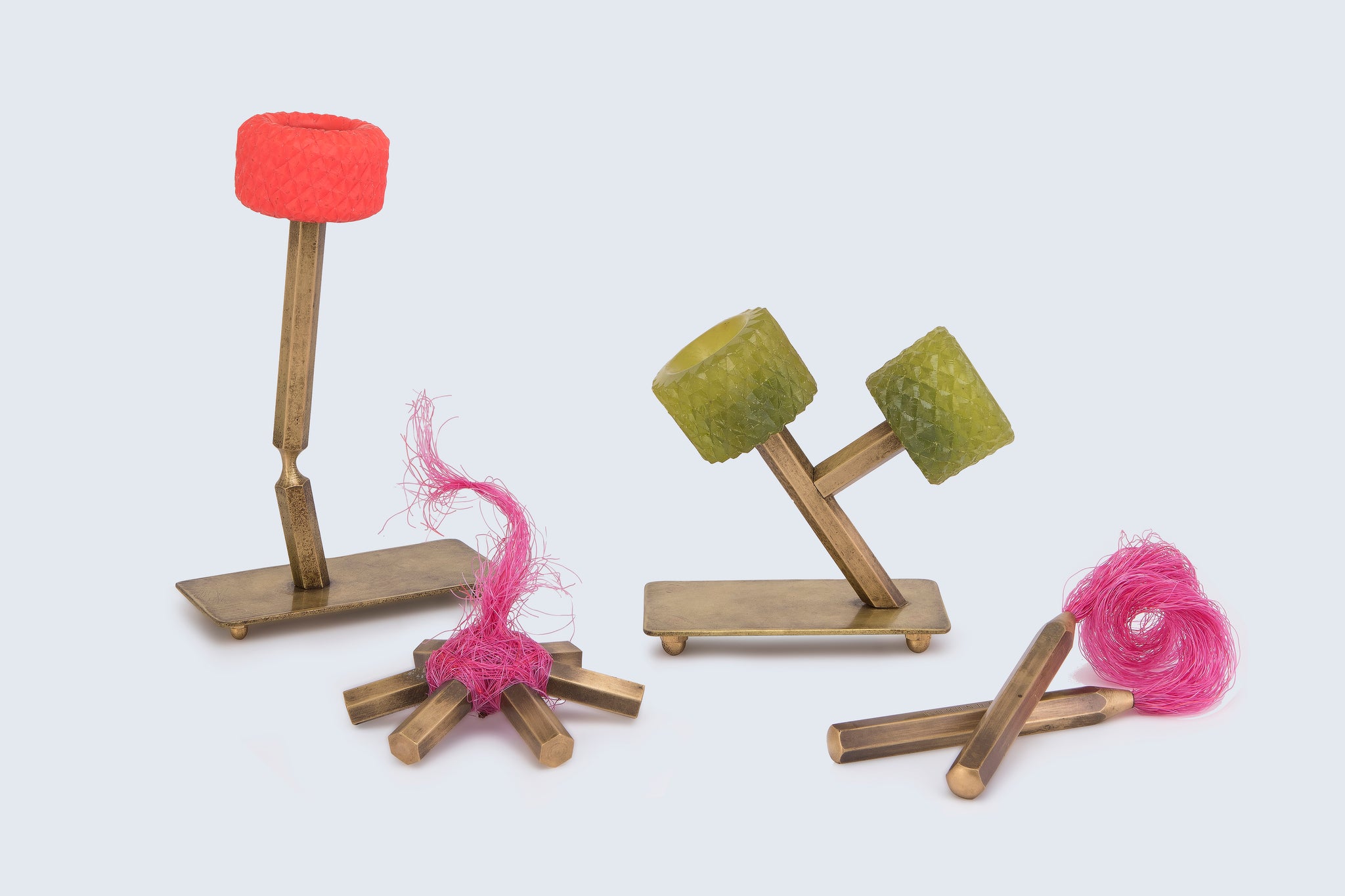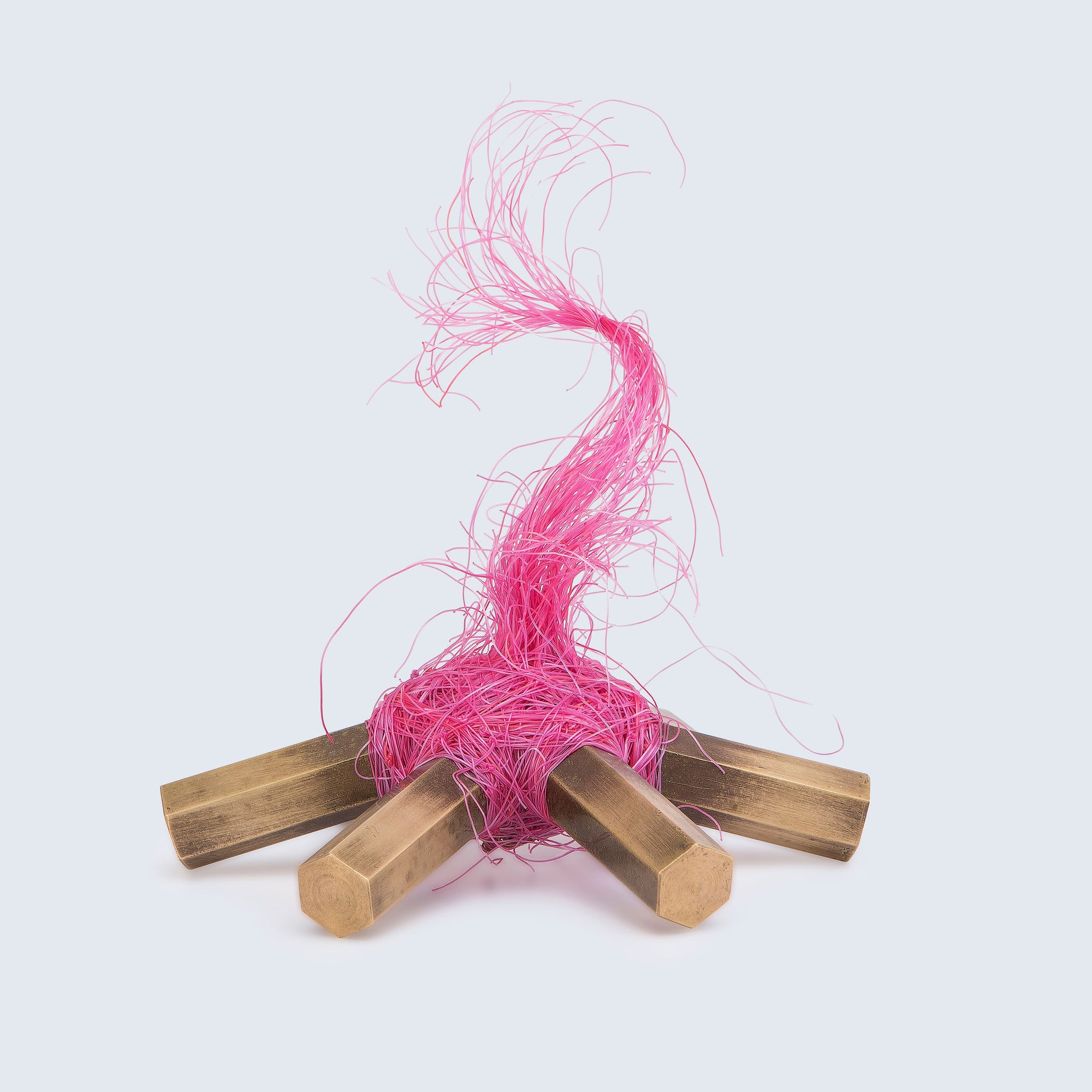 These small handcrafted sculptures are made from cord, bronze, and skateboard wheels – materials the artist often returns to. Each piece in the series highlights a phase of the tree's journey as a commodity, from young sapling, to grown tree being harvested, to a pencil made from the wood, and finally to fire and ash that returns to the ground.
